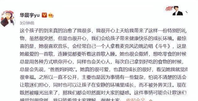 而华晨宇也再次发文示意,孩子很可人,很爱唱歌,是一份稀薄的礼物,但愿她能够在悠闲的环境中成长,不被外界顺心。