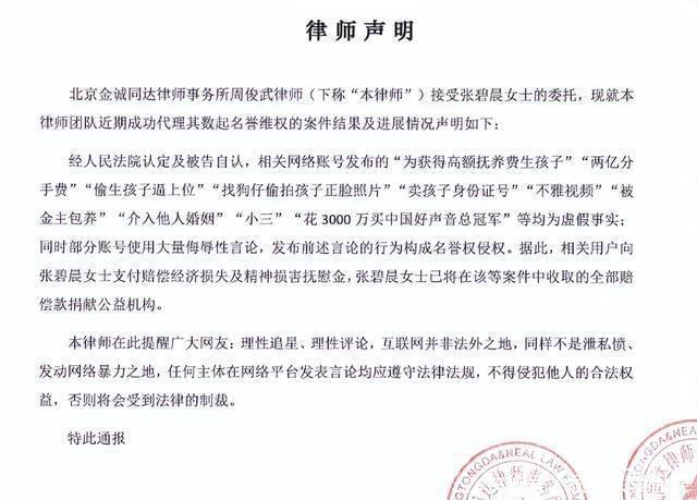 18日,张碧晨方面发表了讼师声明,针对近段时候以来的荟萃据说进行了恢复。